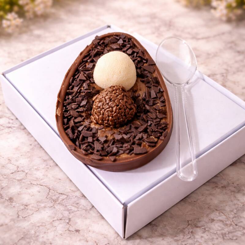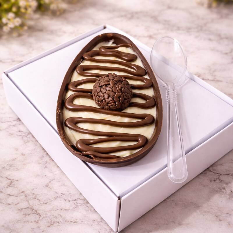 Delicioso ovo de colher com casca de chocolate ao leite 🍫, recheado com creme de Ninho super cremoso 🥛 e finalizado com Nutella e brigadeiro gourmet 🍫✨. Perfeito para quem ama sobremesas irresistíveis para comer de colher! 😍 Peso: 250g ⚖️