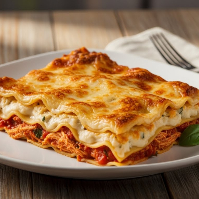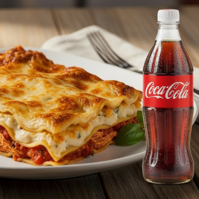 Deliciosa Lasanha de Frango, com recheio generoso, molho vermelho, presunto, macarrão e molho branco, acompanha coca-cola 600 ml.Porção ideal para uma pessoa. Alimento pronto para o consumo!