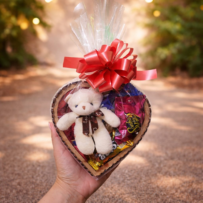 Linda Cestinha em MDF formato de coração, com 5 bombons seleções Lacta ( variados), acompanha um ursinho fofo de chaveiro. Um mimo ideal para presentear!!