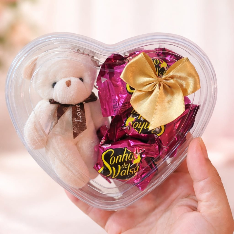 Lindo presente para demonstrar carinho para pessoas especiais. Caixa em formato de coração com 1 chaveiro fofo de Ursinho com um laço escrito "love" com 3 Bombons Sonho de Valsa.