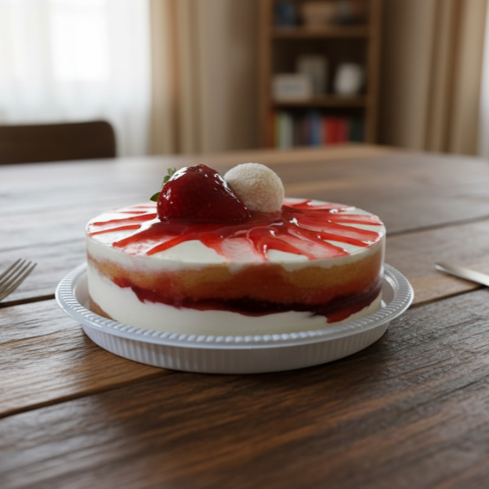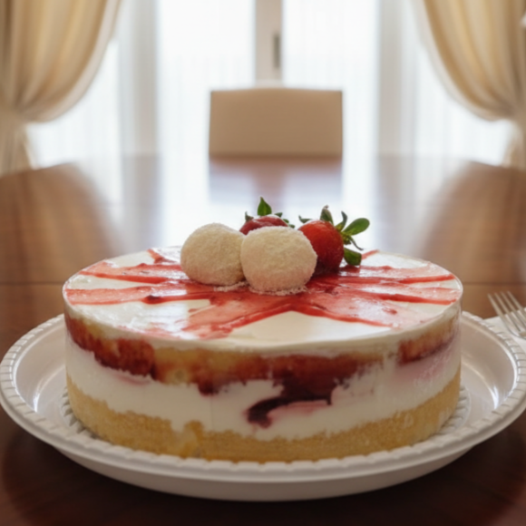 Deliciosa tortinha, ideal para pequenas comemorações, sendo 2 camadas de pão de ló, creme de ninho com Morangos em Calda, ideal para 2 pessoas ou mais.