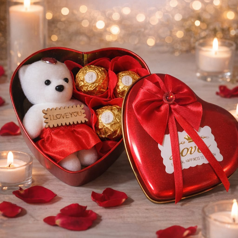 Caixa Metal Coração Com Ursinho + 3 Bombons Ferrero Rocher | Presente Romântico