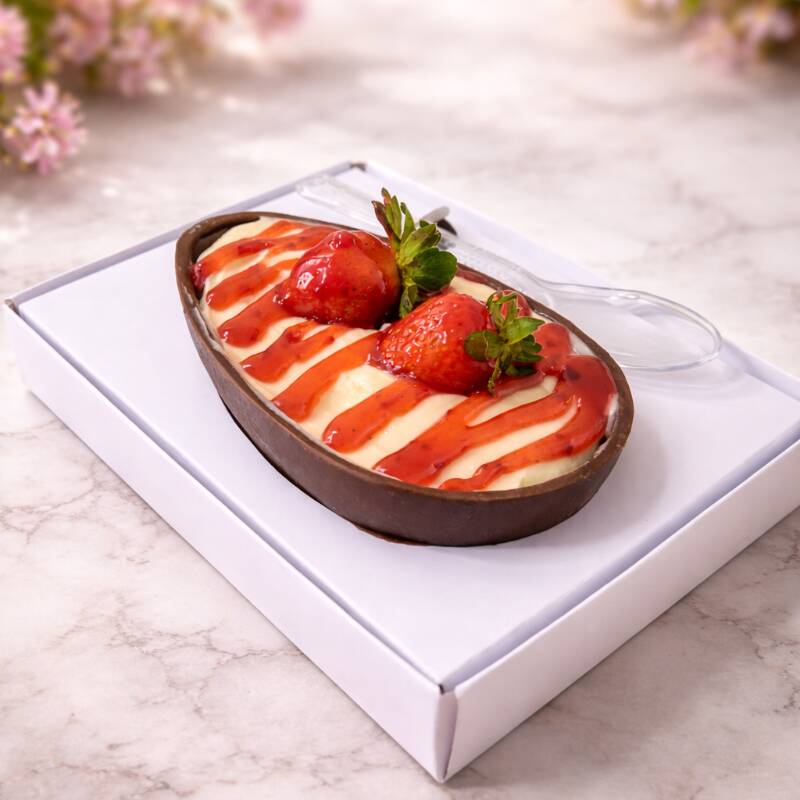 Delicioso ovo de colher com casca de chocolate ao leite, recheado com creme de Ninho super cremoso, finalizado com calda e morangos frescos. Uma combinação irresistível para comer de colher! Peso: 250g.