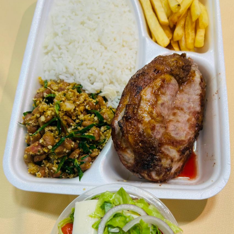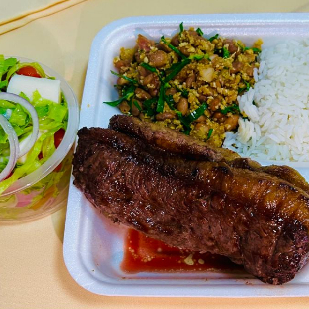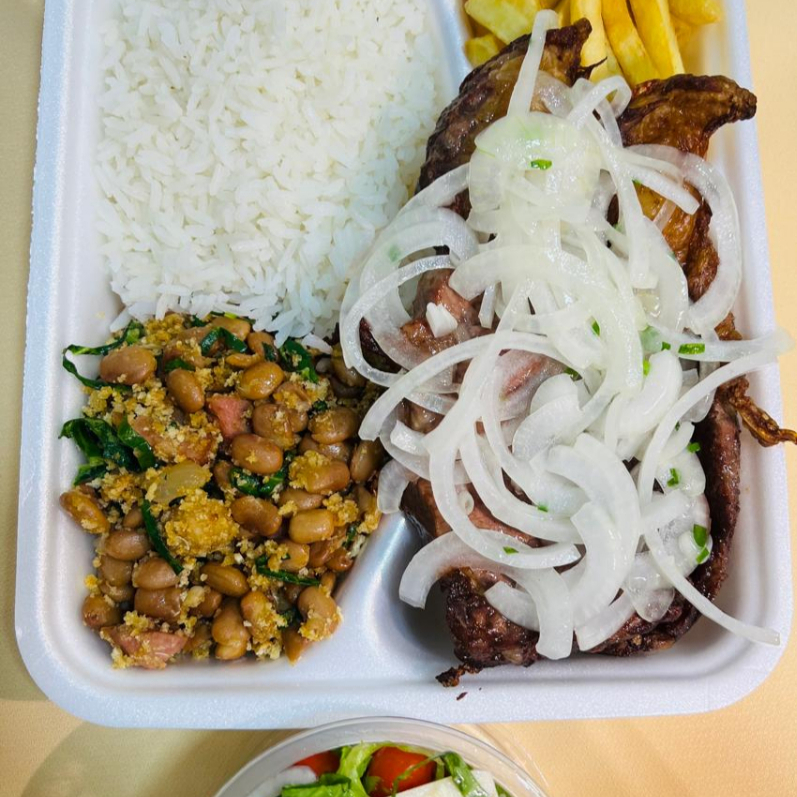 Bife de contrafilé 200gr, Arroz Branco, Feijão Caldo ou Tropeiro, Batata Frita e Salada. Preparo 30-40 min