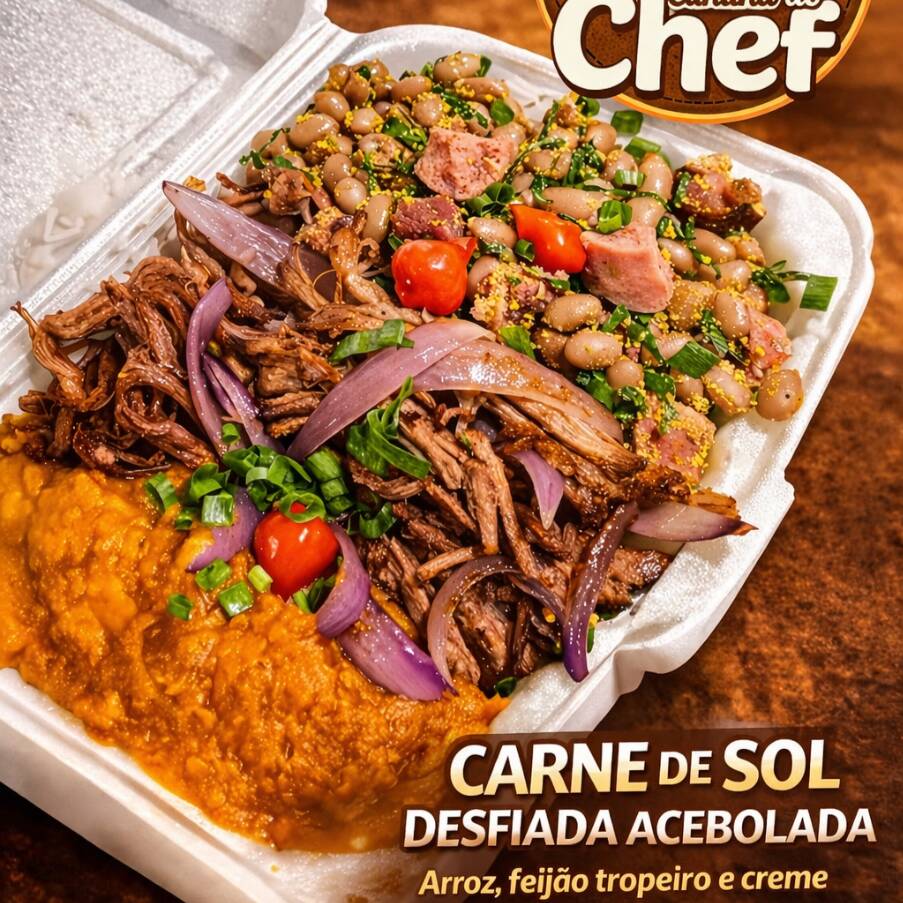 Arroz, carne de sol, bacon, banana frita, ovo frito, milho, cheiro verde e tempero especiais do chefe. 900g de comida. Acompanha salada. Chama que bb que é top