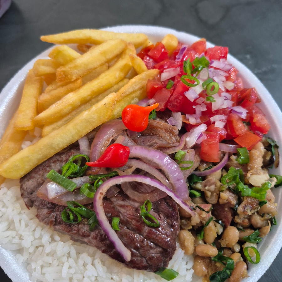 ARROZ BRANCO, FEIJÃO TROPEIRO, BIFE ACEBOLADO, BATATA FRITA E VINAGRETE