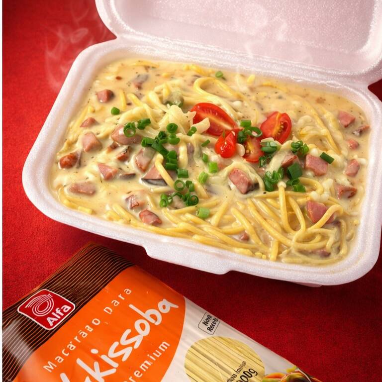 MACARRÃO CREMOSO COM MOLHO BRANCO, BACON, LINGUIÇA, CHEIRO VERDE E TOMATE CEREJA