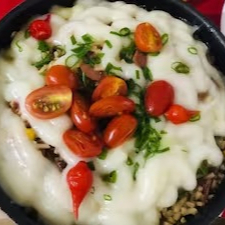 Arroz, carne de sol, linguiça, frango, bacon, tempero especial do chefe, mussarela e finalizada com banana da terra em cubos - Panelinha de textura cremosa)