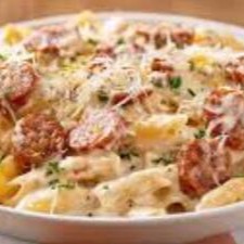 Frango: Massa Penne, Peito De Frango Desfiado, Alho, Cebola, Limon Pepper, Creme De Leite, Cream Cheese, Queijo Parmesão E Mussarela, Azeite E Azeitona, E Bacon
