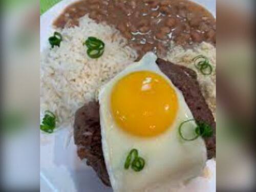 Bife com ovos, arroz, feijão