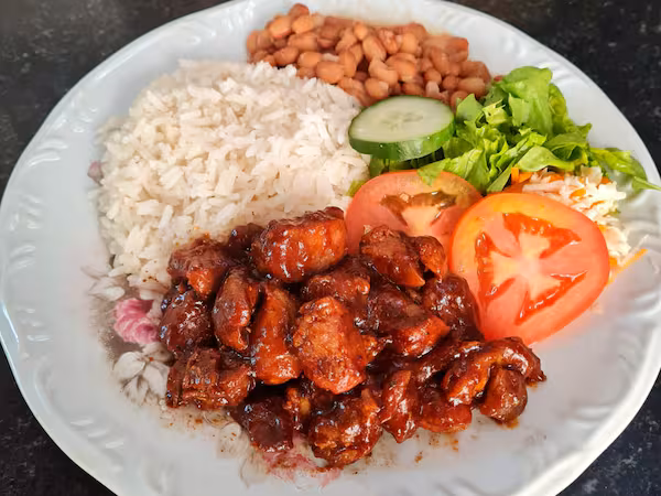 Cubinhos Suíno Especial, arroz, feijão, salada