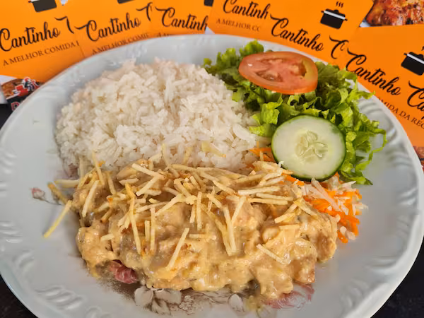 Strogonoff de frango bem cremoso e temperado. Acompanhado de arroz branco, batata palha e salada. Tudo isso bem separado em uma marmitex com 4 divisórias. tag: marmita; prato executivo; marmitex;