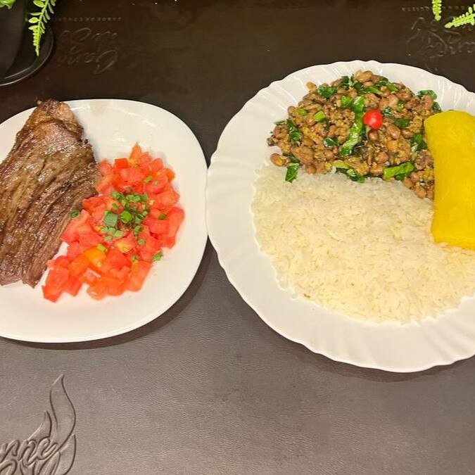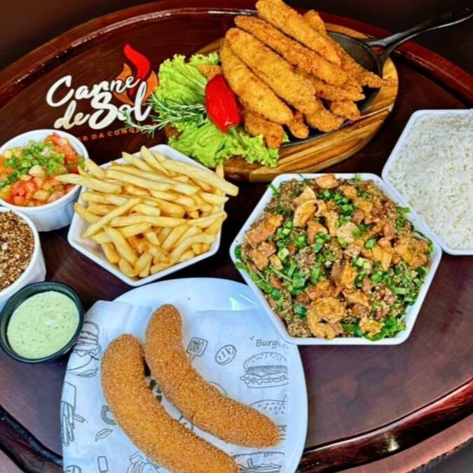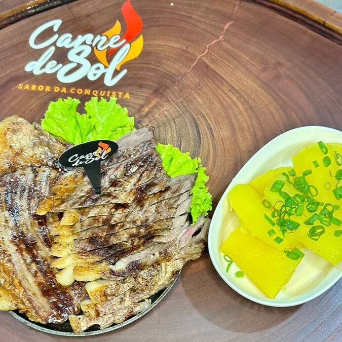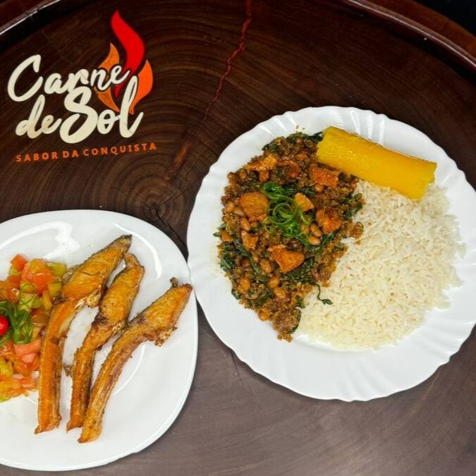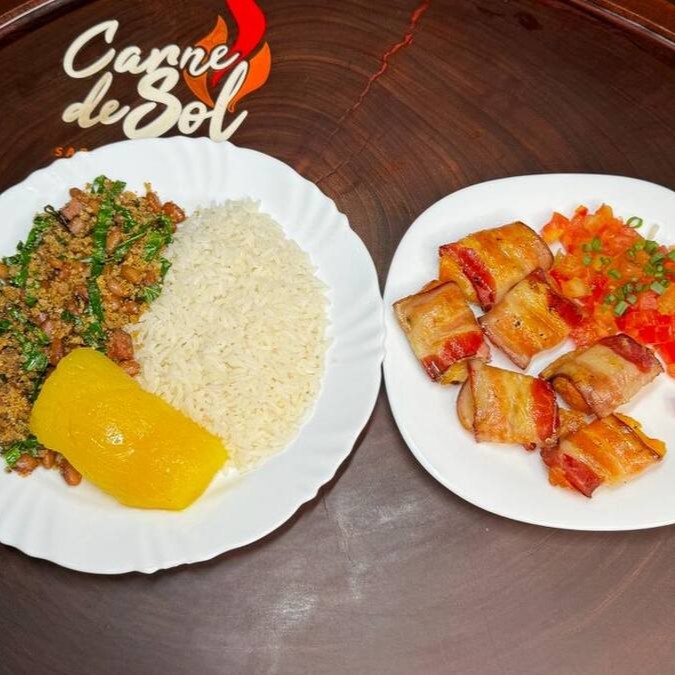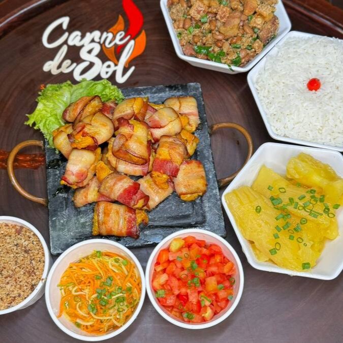 Acompanhada de Arroz, 500gr de Carne de Sol, Feijão Tropeiro, Mandioca, Vinagrete, Paçoca, Batata Frita e uma salada da casa.