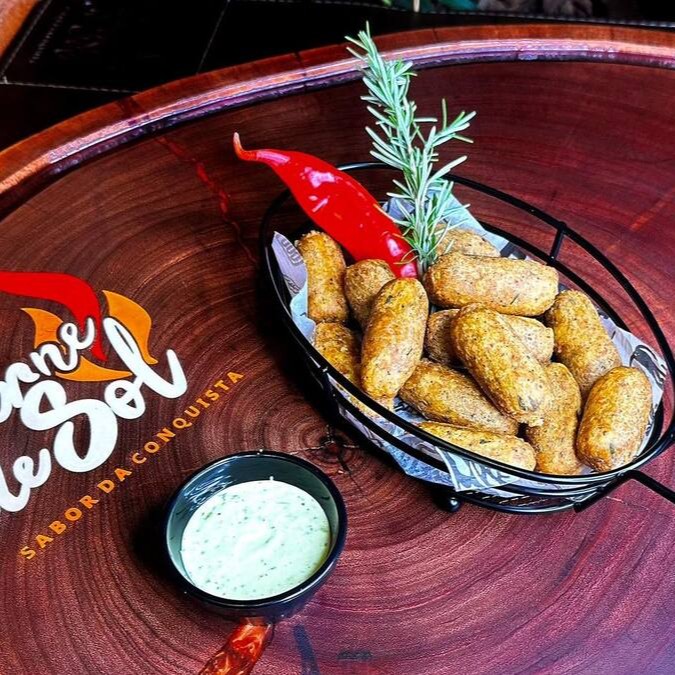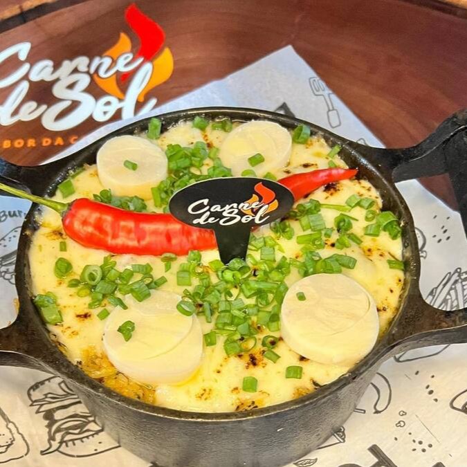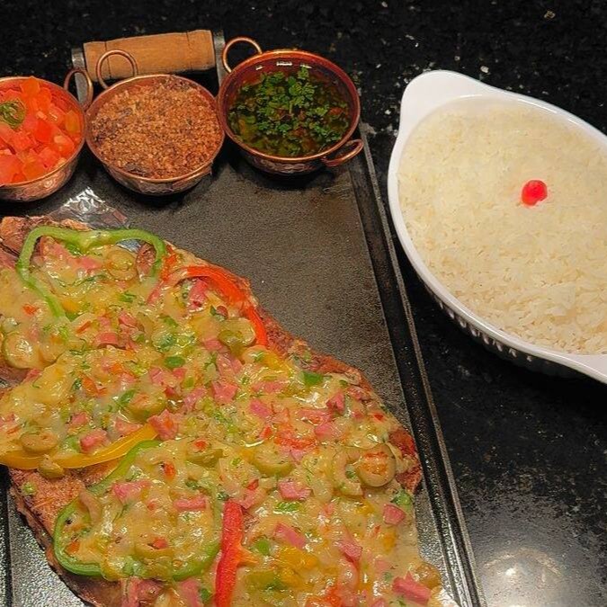 Deliciosa panelinha composta por arroz, carne de sol, azeitona, palmito, linguiça calabresa, bacon e queijo.