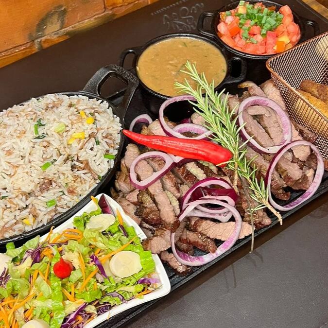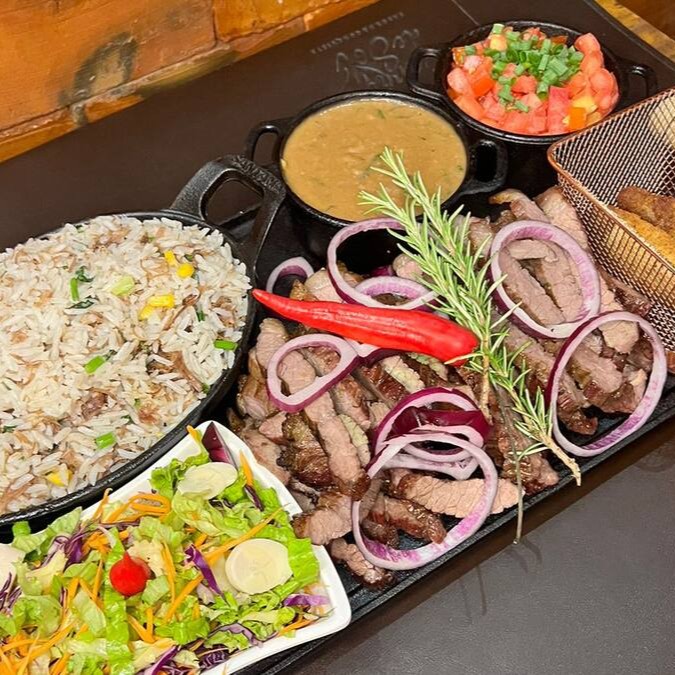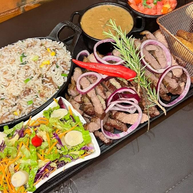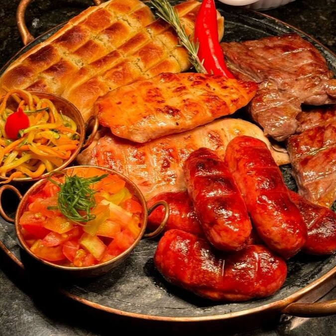 Aprox 700g variada de Carne de Sol, Filé de Frango grelhado e Linguiça Toscana a moda. Acompanha: Pão de Alho, Salada da Casa, Vinagrete no azeite, Manteiga do Sertão, Arroz e Feijão Tropeiro.