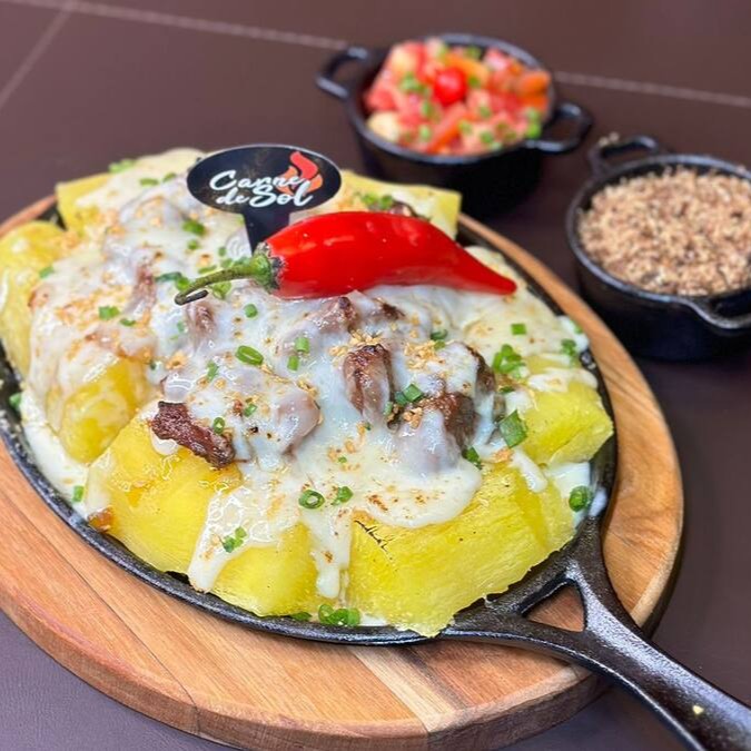500 Gramas De Carne De Sol Na Chapa Com Mandioca Mussarela Pimentão Acompanha Farofa Da Casa E Vinagrete