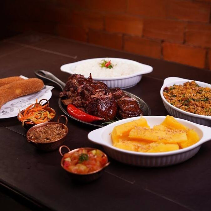 Arroz biro-biro cremoso, tutu de feijão com bacon e calabresa, vinagrete no Azeite, banana à milanesa, mix de salada e cupim na brasa com manteiga do sertão.