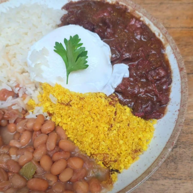 Arroz, feijão, carne, ovo pochê, banana empanada e farofa
