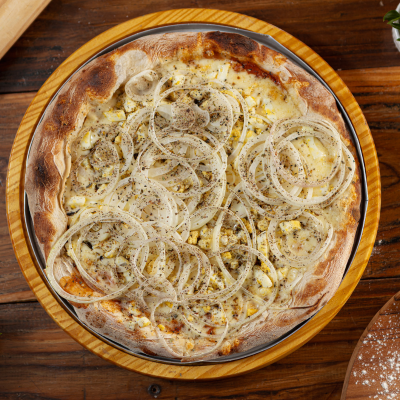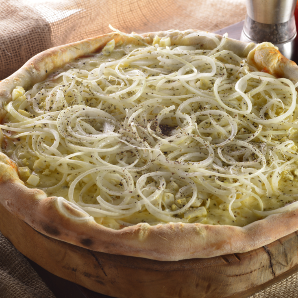 Ovos, Cebola e Mussarela Sobre Molho de Tomate Temperado com Pimenta do Reino e Orégano. Um Sabor Clássico e Marcante Que Representa a Verdadeira Pizza Brasileira em Cada Fatia.
