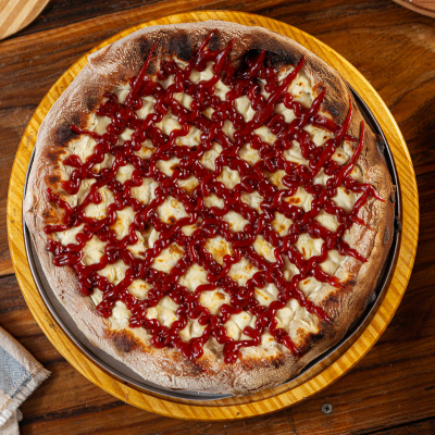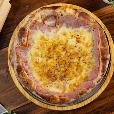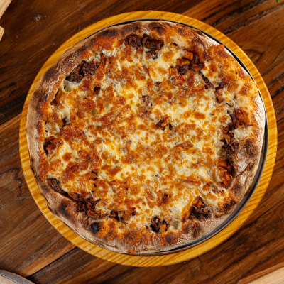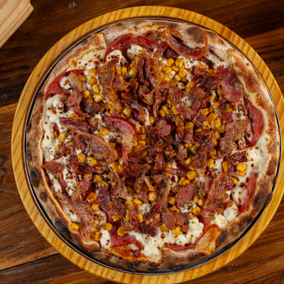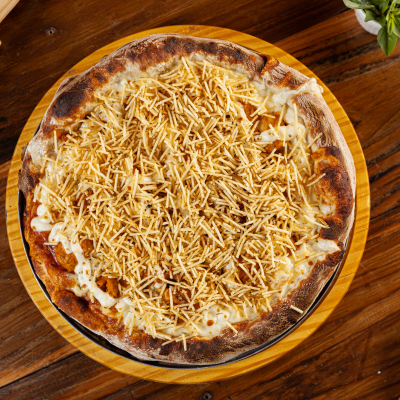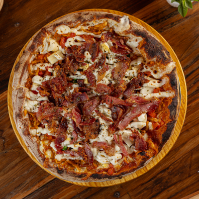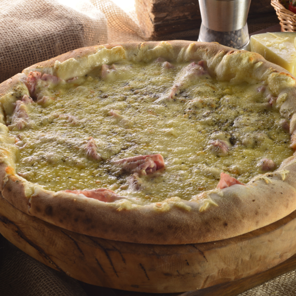 Frango Desfiado, Palmito, Ervilha, Tomate Picado, Catupiry e Bacon Sobre Muçarela Derretida e Molho Artesanal. Uma Explosão de Sabores e Texturas em Cada Mordida!