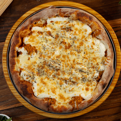 Molho Especial, Frango Desfiado, Creme de Leite, Mussarela Derretida e Orégano. Cremosa, Reconfortante e Cheia de Sabor em Cada Pedaço! Peça Agora!