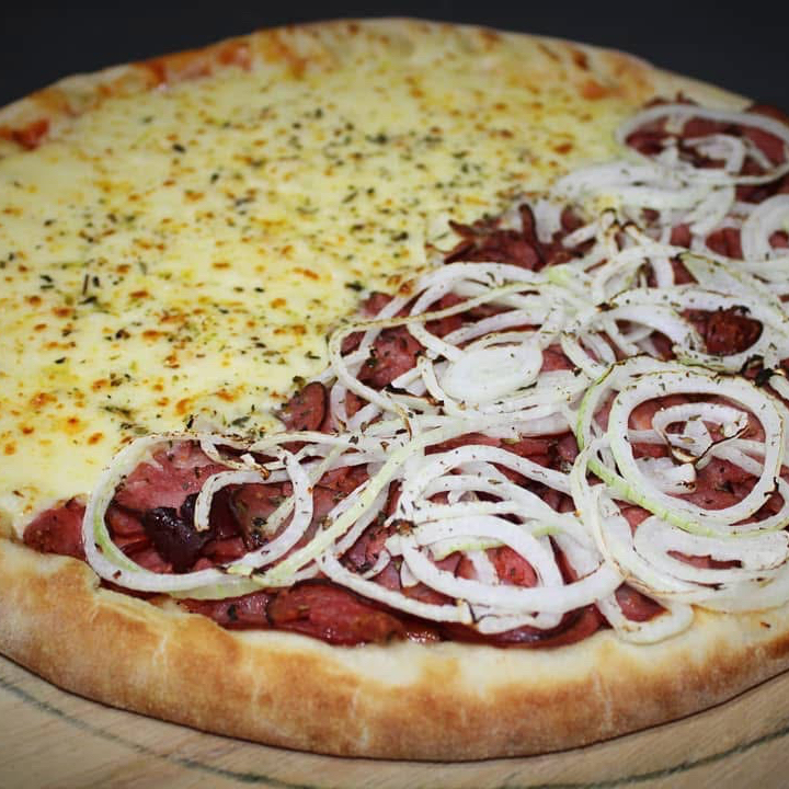 Pizza Brasileira: molho de tomate, mussarela, ovos, cebola, pimenta do reino e orégano. Uma explosão de sabores brasileiros em cada mordida.