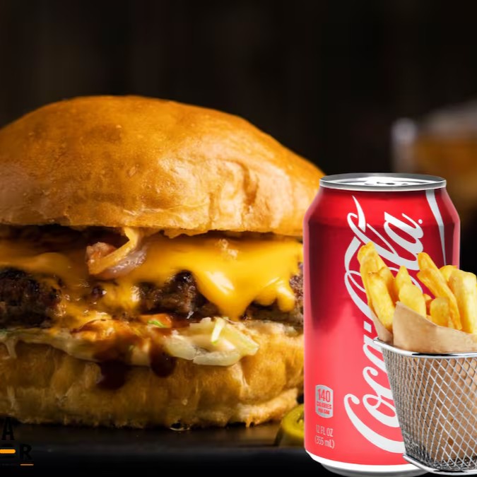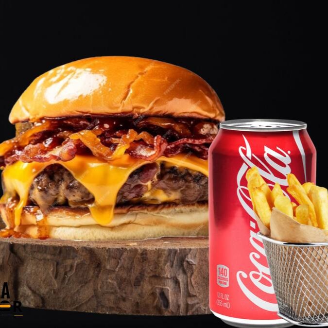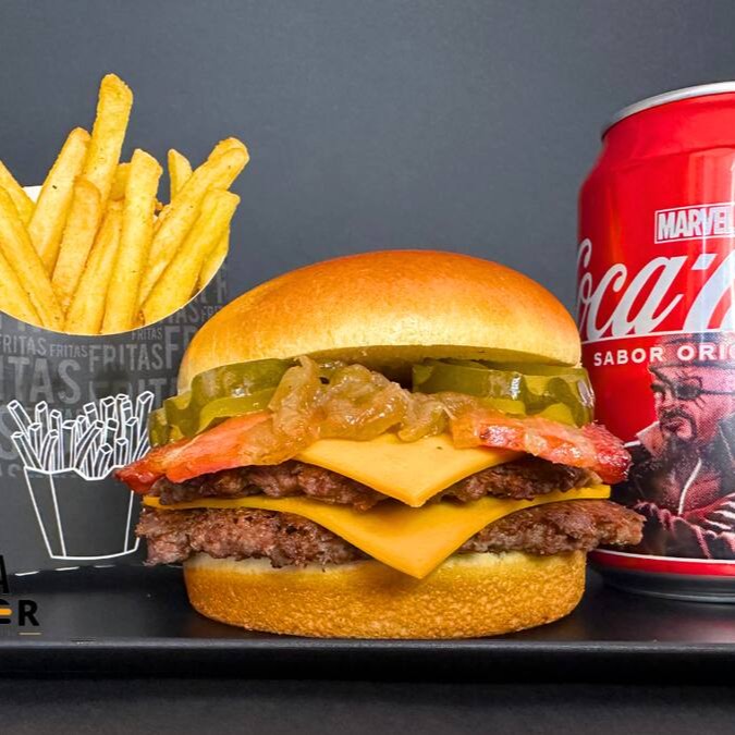 Dois hambúrgueres de 100g no pão brioche, com cheddar, bacon, cebola caramelizada, picles e maionese. Acompanha batata e Coca-Cola lata 350ml.