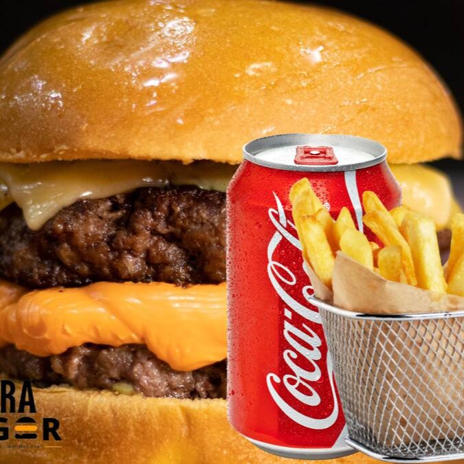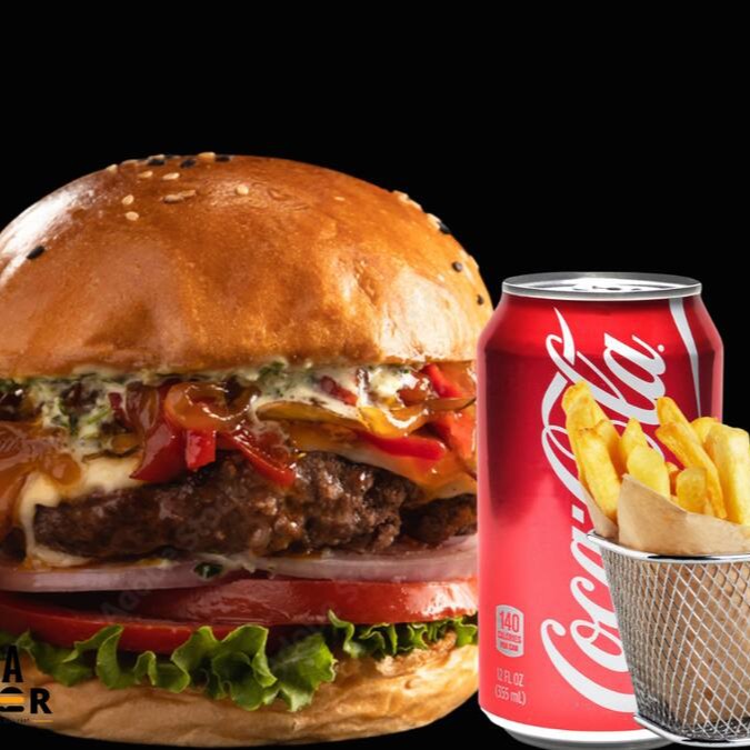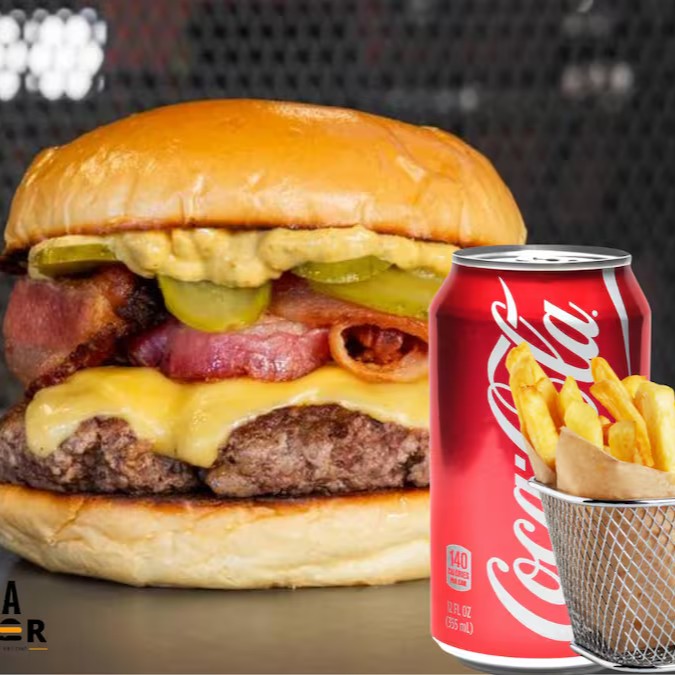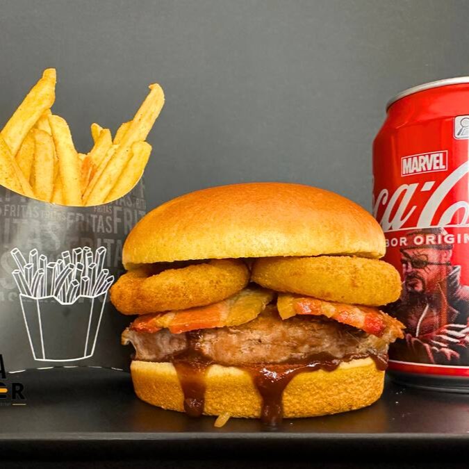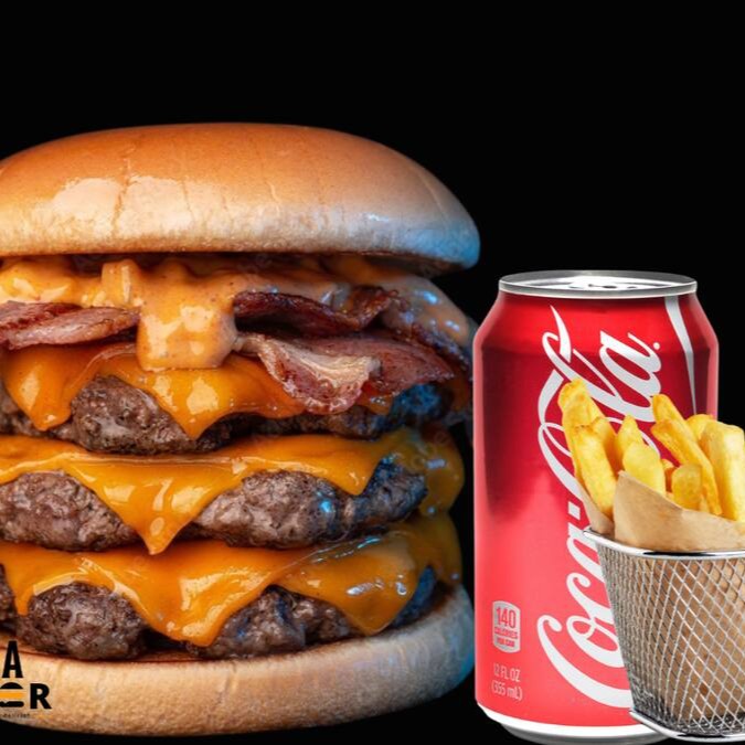 Três hambúrgueres de 100g no pão brioche, com cheddar, bacon, cebola caramelizada, picles e maionese da casa. Acompanha batatas fritas ou anéis de cebola e Coca-Cola lata 350ml. Uma experiência gastronômica definitiva!