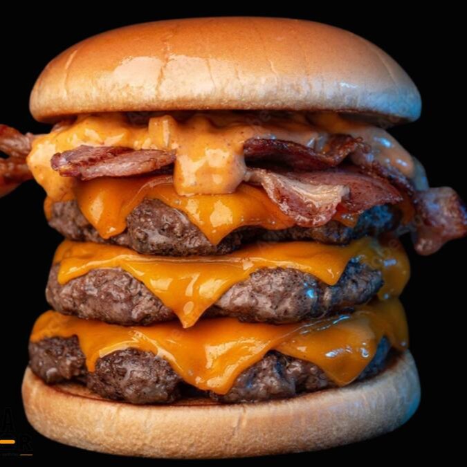 Três hambúrgueres de 100g no pão brioche, com cheddar derretido, bacon crocante, cebola caramelizada, picles crocantes e maionese da casa. Um verdadeiro banquete para os amantes de carne!