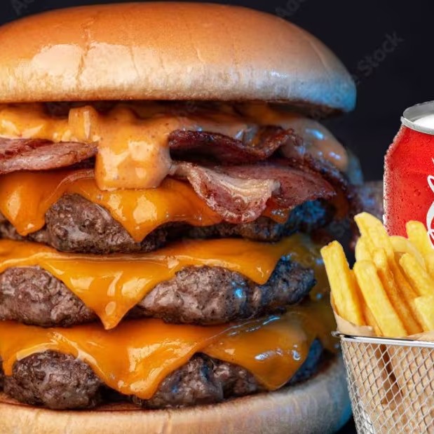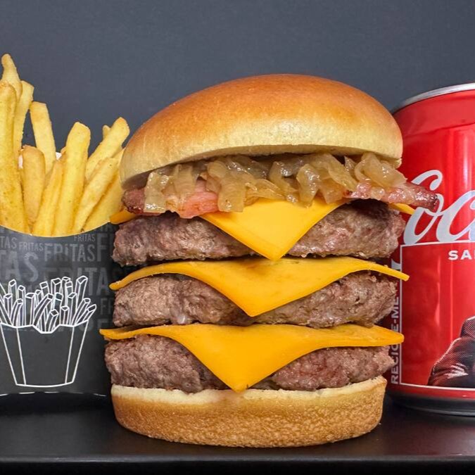 Três hambúrgueres de 160g no pão brioche, com bacon crocante, cheddar derretido e cebola caramelizada. Acompanha batata frita e sua escolha de um Refri lata 350ml ou suco lata. Uma experiência gourmet incomparável!