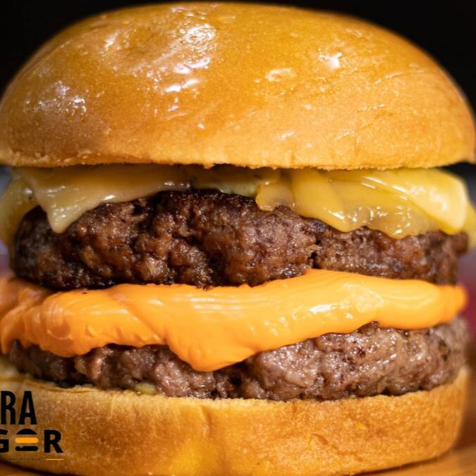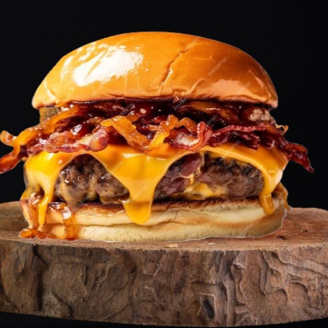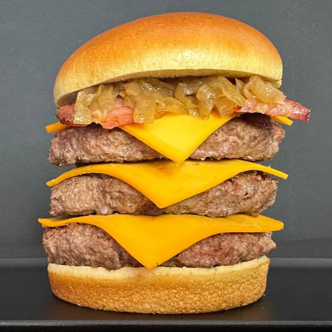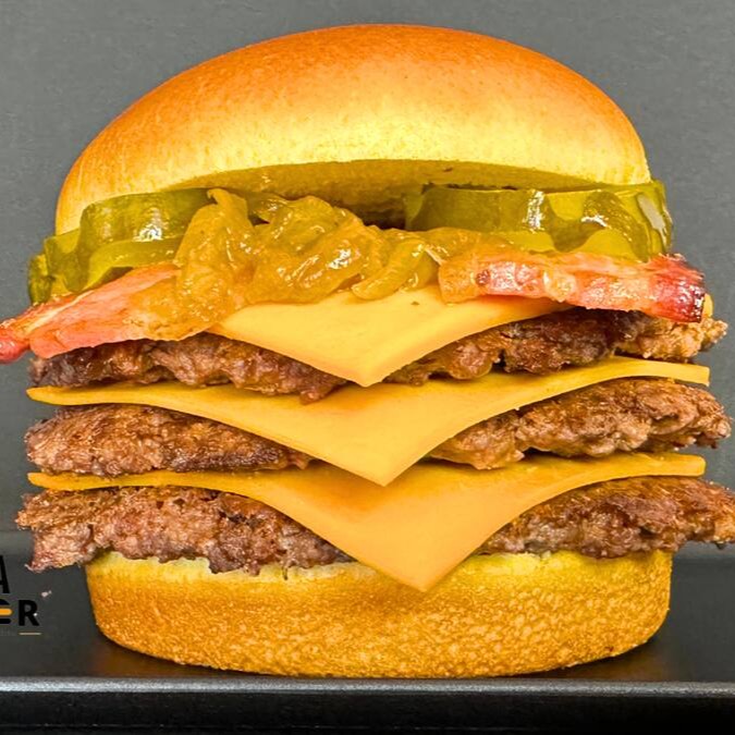 Três hambúrgueres bovinos de 100g no pão brioche, com cheddar derretido, bacon crocante, cebola caramelizada, picles e maionese da casa. Um verdadeiro banquete para amantes de carne!