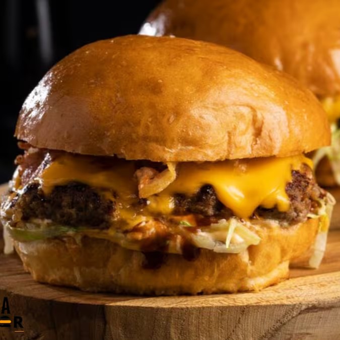 Dois hambúrgueres de 100g no pão brioche, com bacon crocante, cheddar derretido, cebola caramelizada, picles e maionese da casa. Um sabor irresistível!