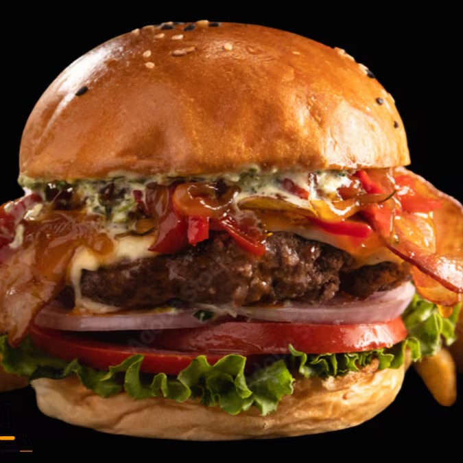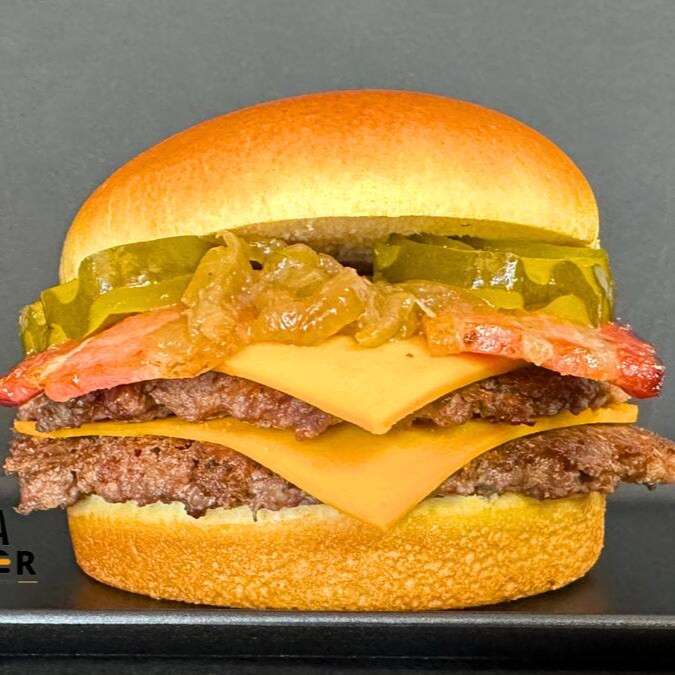 Dois hambúrgueres de 100g no pão brioche, com bacon crocante, cheddar derretido, cebola caramelizada, picles crocantes e maionese da casa. Uma harmonia de sabores gourmet!