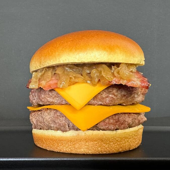 Dois hambúrgueres de 160g no pão brioche, com bacon crocante, cheddar derretido e cebola caramelizada. Uma explosão de sabores a cada mordida!