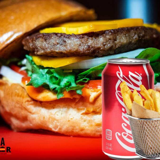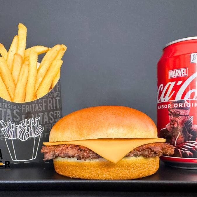 Hambúrguer bovino de 160g no pão brioche, com cheddar suave e maionese da casa. Acompanha batatas fritas ou anéis de cebola e Coca-Cola lata 350ml ou suco. Simplicidade e sabor em harmonia!