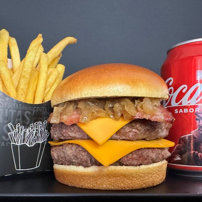 Dois hambúrgueres de 160g, bacon crocante, cheddar derretido e cebola caramelizada. Acompanha batata frita e sua escolha de um Refri lata 350ml ou suco lata. Explosão de sabores garantida!