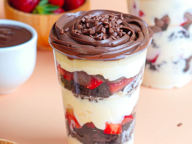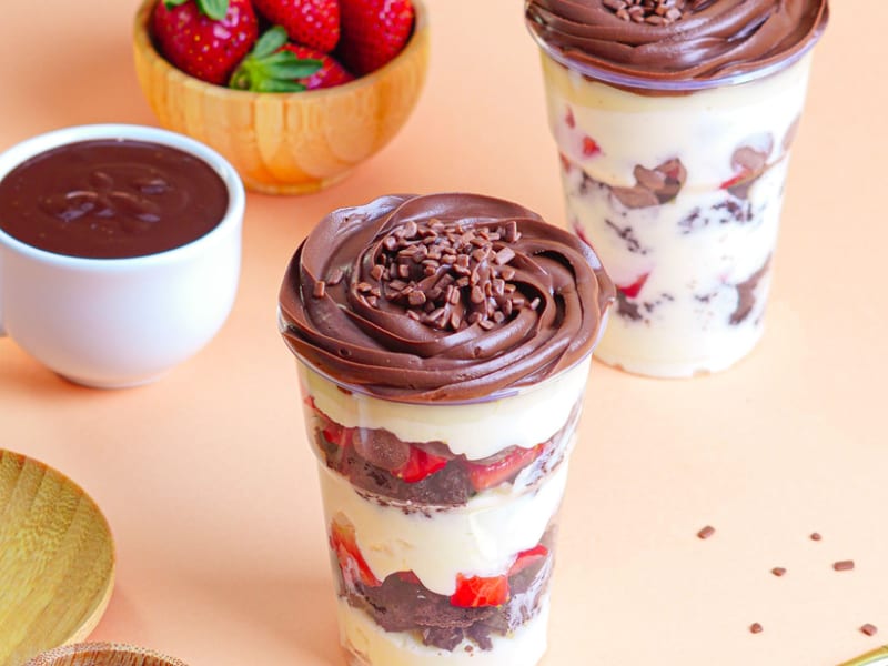 O mais vendido! Este copo é composto por uma mousse suave de leite Ninho, harmonizado perfeitamente com morangos. Acompanha ainda pedaços de brownie e gotas de chocolate dando aquela crocância. E como se não fosse suficiente, adicionamos uma generosa camada de brigadeiro branco e de Nutella. Uma verdadeira sinfonia de sabores que irá encantar o seu paladar.