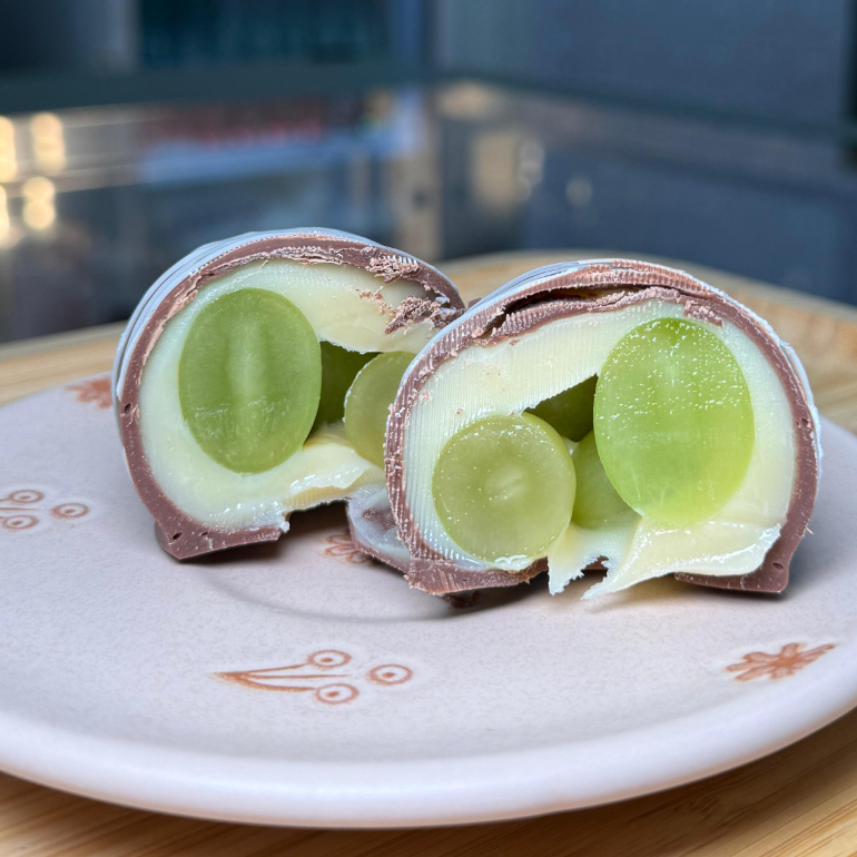 Brigadeiro branco cremoso com uva verde sem semente, envolto em uma casquinha de chocolate ao leite. Um clássico refrescante e irresistível!