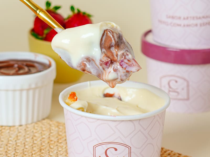 Sorvete de baunilha cremoso batido com calda de morango, servido com borda de Nutella. Uma fusão perfeita