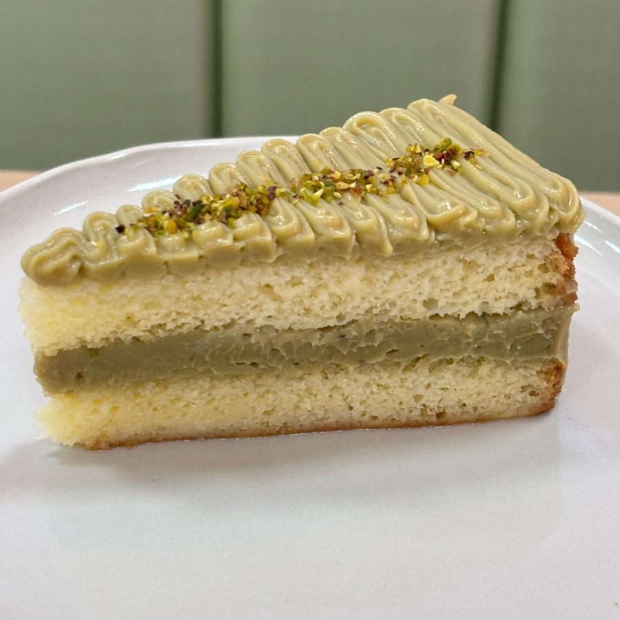 Fatia de Bolo de Pistache Bolo macio e úmido, feito com pistache selecionado, sabor marcante e textura delicada. Uma sobremesa sofisticada, perfeita para quem ama pistache e busca uma experiência única a cada fatia.