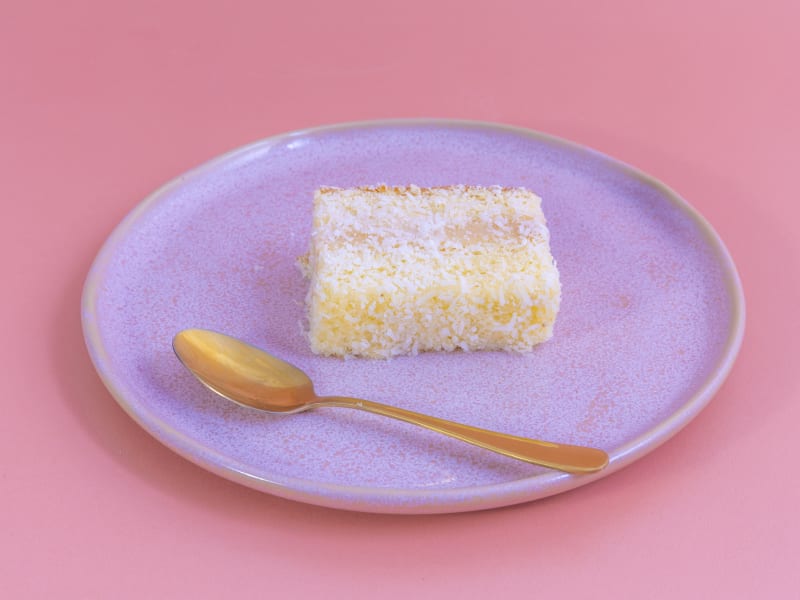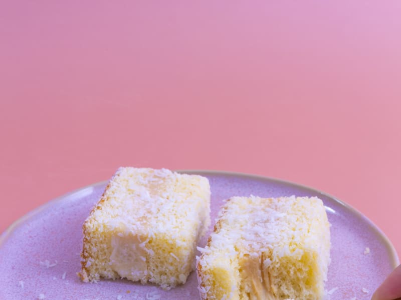 Pedaço de bolo bem molhadinho, com recheio coco e abacaxi cremoso.