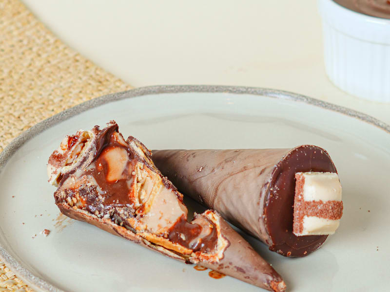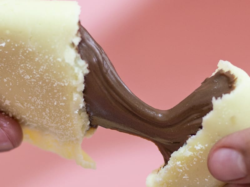 A casquinha crocante, delicadamente regada com um sofisticado chocolate meio amargo, com um recheio deslumbrante. O ganache de Nutella cremoso, unido ao creme e pedaço de Kinder Bueno, saboroso suave, criam uma combinação irresistível.