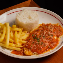 Delicioso Bife à milanesa 200g, molho pomodoro, arroz branco e batata frita. _ _#farofa #torresmo #bifé #costela #arroz #frango #carne #batata