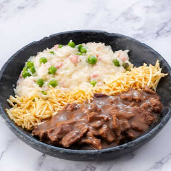 Deliciosas iscas de filé mignon 150g ao molho hot, arroz cremoso com ervilhas, presunto e batata palha. _ _#farofa #torresmo #bifé #costela #arroz #frango #carne #batata