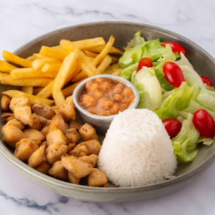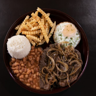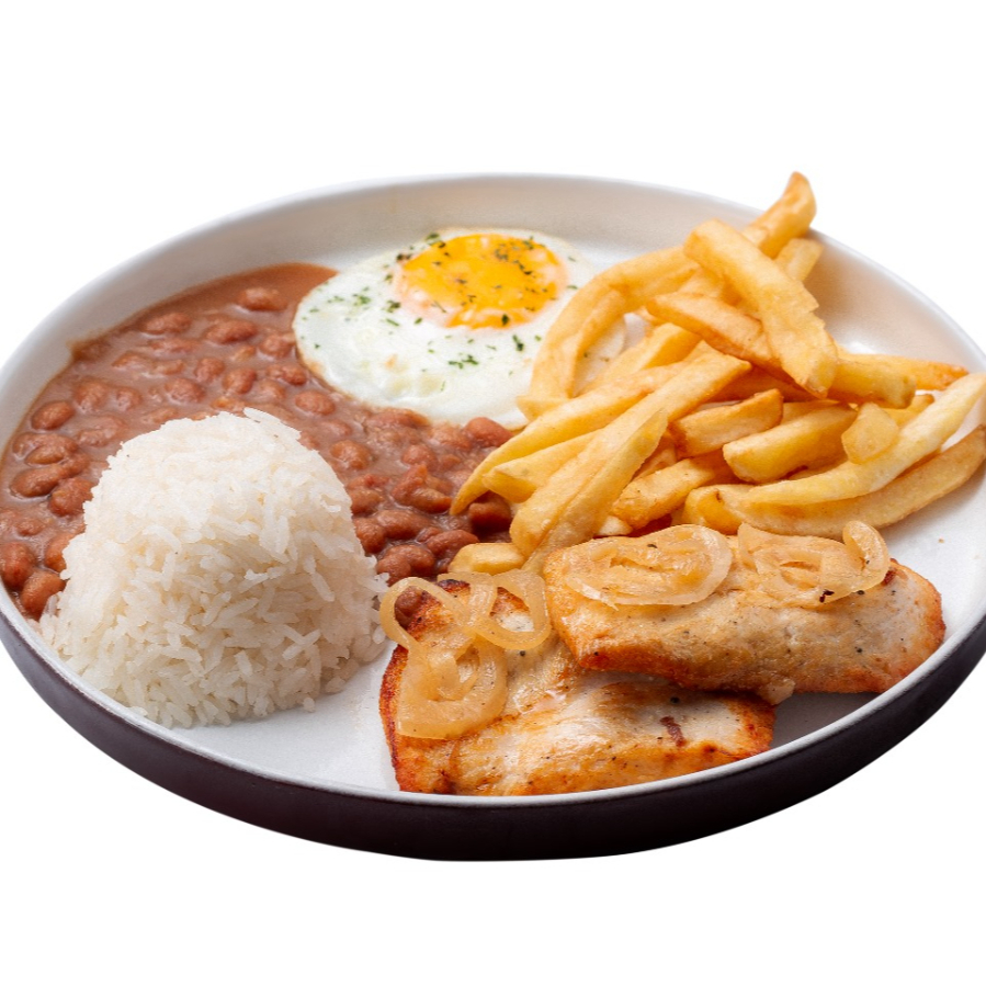 Bife de frango acebolado, feijão de caldo, fritas, ovo estalado e arroz branco.
