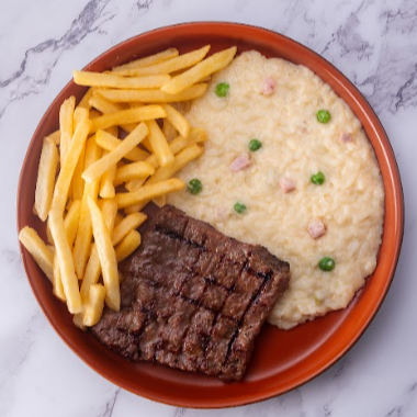 Delicioso corte de 170g, arroz biro biro, batata frita, chimichurri. _ _#farofa #torresmo #bifé #costela #arroz #frango #carne #batata