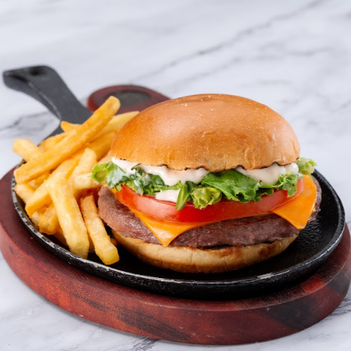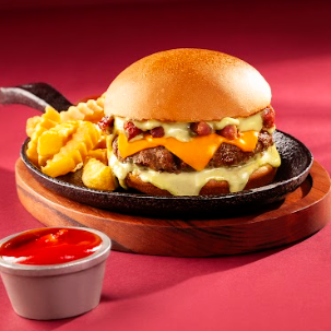 (Somente o sanduíche) Pão brioche amanteigado, hambúrguer 210g angus (blend fraldinha e maminha), queijos cheddar, maionese de ervas e cubos de bacon.