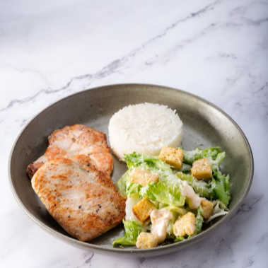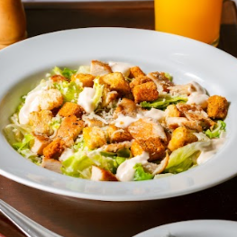 Deliciosa salada com alface americana, parmesão, frango grelhado, croûtons e molho caesar. _ _#farofa #torresmo #bifé #costela #arroz #frango #carne #batata