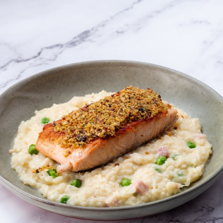 Delicioso Salmão grelhado 200g, arroz cremoso com ervilhas e presunto e crosta de farofa especial. _ _#farofa #torresmo #bifé #costela #arroz #frango #carne #batata