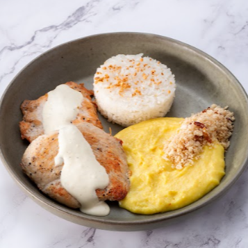 Delicioso Filés grelhados 200g, arroz branco com, alho, creme de ervas, de mousseline de mandioca e farofa especial. _ _#farofa #torresmo #bifé #costela #arroz #frango #carne #batata
